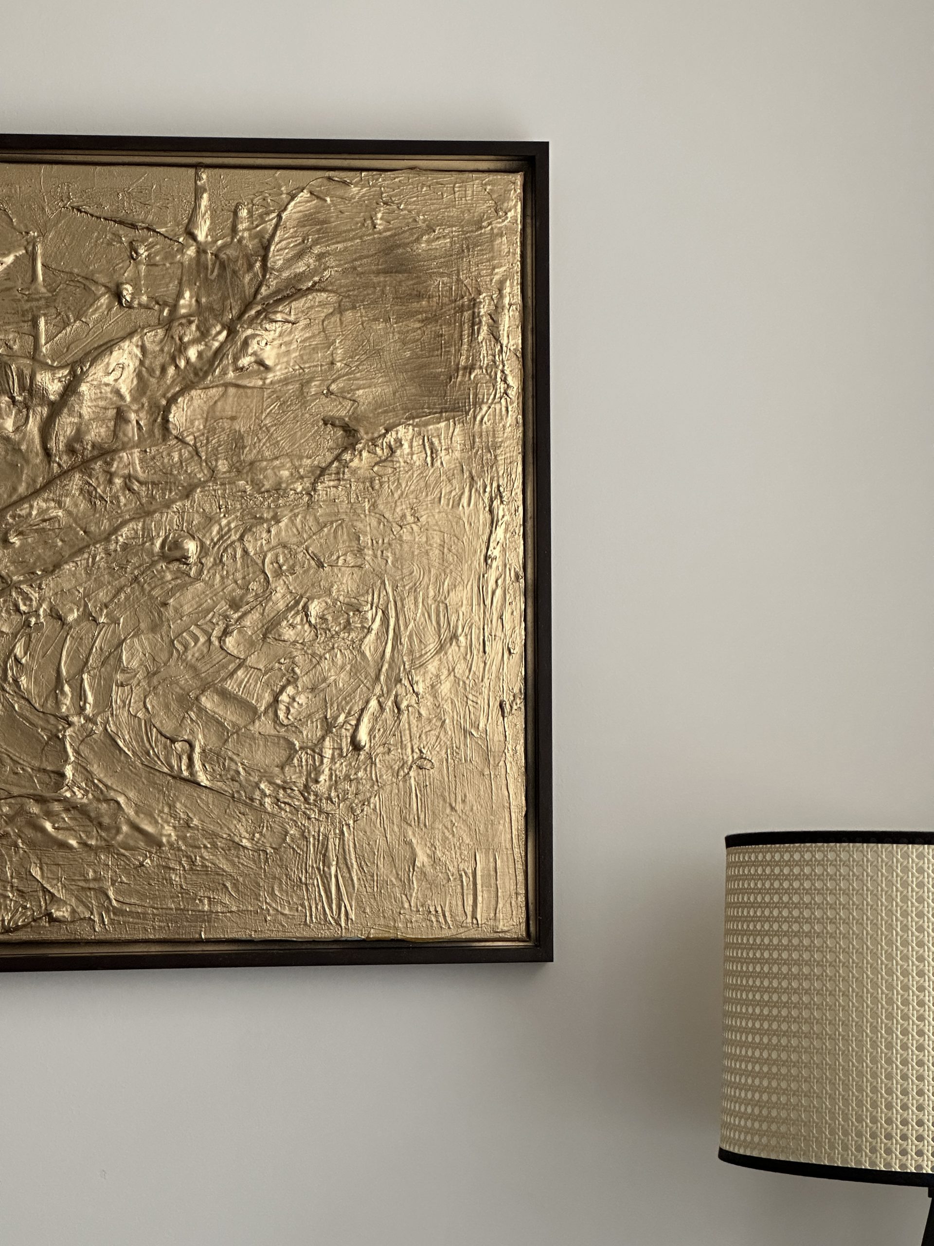 Das goldene Bild im schwarzen Rahmen, das den Namen “Rheingold” trägt, ist ein wahres Meisterwerk, das die Ästhetik und Philosophie der Künstlerin widerspiegelt. Der glänzende Goldton des Bildes, der an das mythische Rheingold der germanischen Sage erinnert, und der elegante schwarze Rahmen stehen symbolisch für das Zusammenwirken von Licht und Schatten, von Klarheit und Mysterium. Die Struktur des Bildes, das sich leicht 2 cm über die Oberfläche wölbt, verleiht dem Kunstwerk nicht nur eine haptische, sondern auch eine metaphysische Dimension. Es zeigt, wie das Schöne nicht nur durch seine äußere Erscheinung, sondern auch durch seine tieferen Bedeutungen entzücken kann.